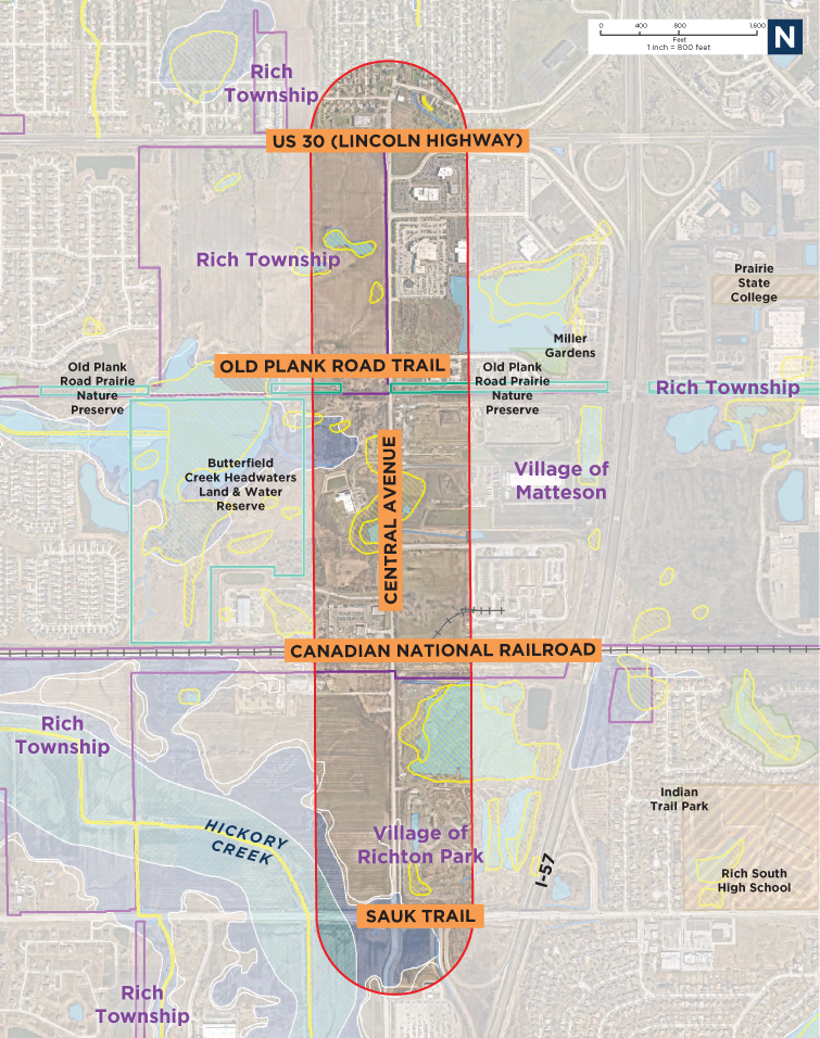 The 1.5-mile project area is located within the Villages of Matteson, Richton Park and unincorporated Rich Township, and crosses the Canadian National Railroad (CNRR) and Old Plank Road Trail. DoTH has initiated this study to advance the long-term goals outlined in Cook County’s Long Range Transportation Plan Connecting Cook County.